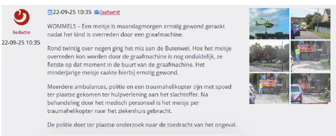 Medewerkers van SWF en BAM signaleren dat er veel fietsers zijn die de borden negeren en zo plompverloren voor de machine in het werkvak staan. Dhr Jan Baron van SWF geeft aan dat dit levensgevaarlijk kan zijn. Hij verwijst naar een ongeval nabij Wommels op 22 sept.