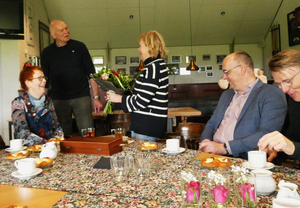 Na de onthulling vertrok het gezelschap naar het dorpshuis, waar onder genot van een bakje koffie of thee met wat lekkers een gezellige nazit plaats vond. De echtgenote van Louis, die overigens in het complot zat om Louis zonder voorkennis naar Folsgeare te doen komen, kreeg een mooi boeket aangeboden door de voorzitter van dorpsbelang Nic Westrik.