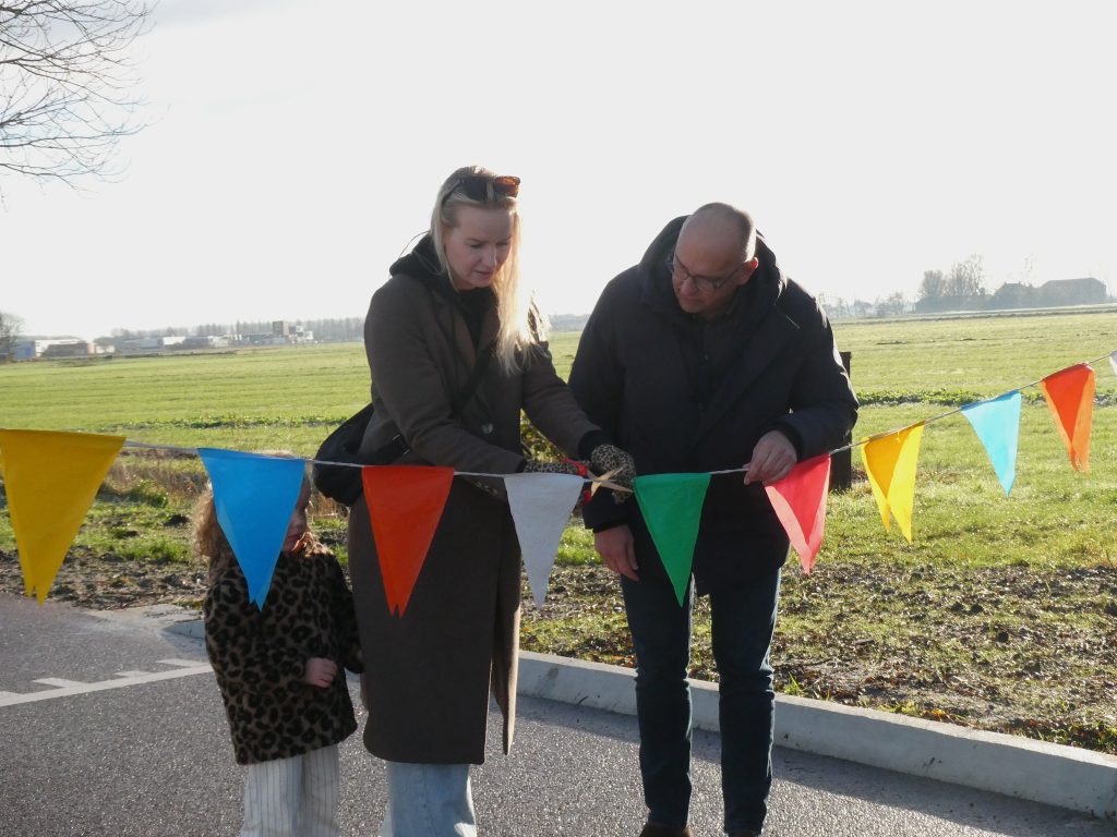 Hoewel de weg al een tijdje weer volop gebruikt kan worden, is zaterdag 21 november de weg officieel geopend. Moniek Broersma en haar dochter knipten samen met wethouder Michel Rietman het lint met vlaggetjes door.